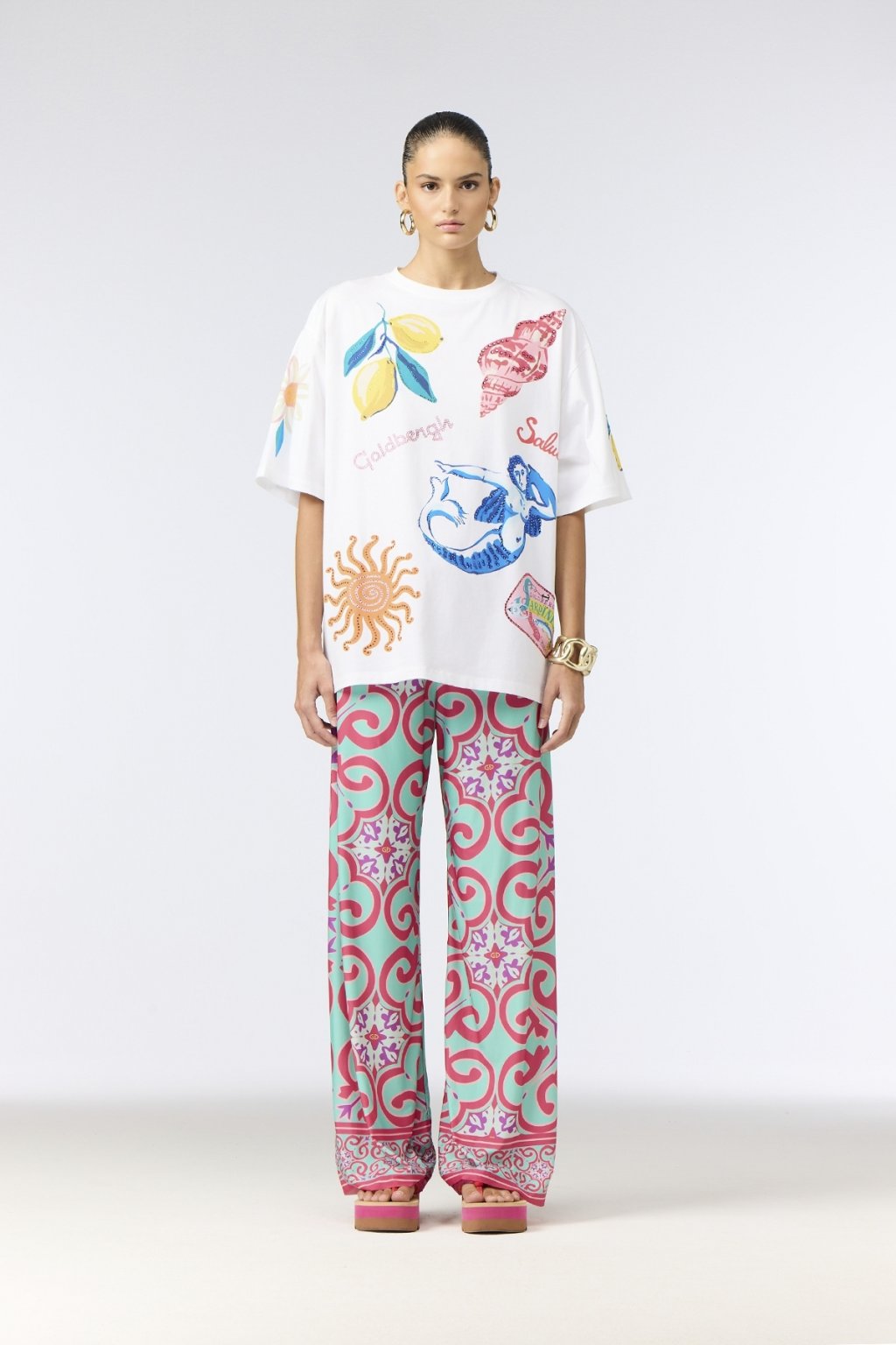 Tričko MEDIRA je výrazný a farebný kúsok, ktorý zaujme celoplošným Capri inšpirovaným artworkom na prednej, zadnej strane aj rukávoch. Tento detail dodáva tričku moderný a živý vzhľad, ktorý okamžite upúta pozornosť. Vyrobené je z kvalitného jersey úpletu s vysokým podielom GOTS certifikovanej organickej bavlny, čo zabezpečuje mäkkosť, priedušnosť a pohodlie počas celodenného nosenia. Voľnejší strih (loose fit) poskytuje uvoľnený a pohodlný look, ktorý sa ľahko kombinuje s rôznymi outfitmi. Okrúhly výstrih dopĺňa jemný gumový štítok na boku, podčiarkujúci prémiový charakter trička.